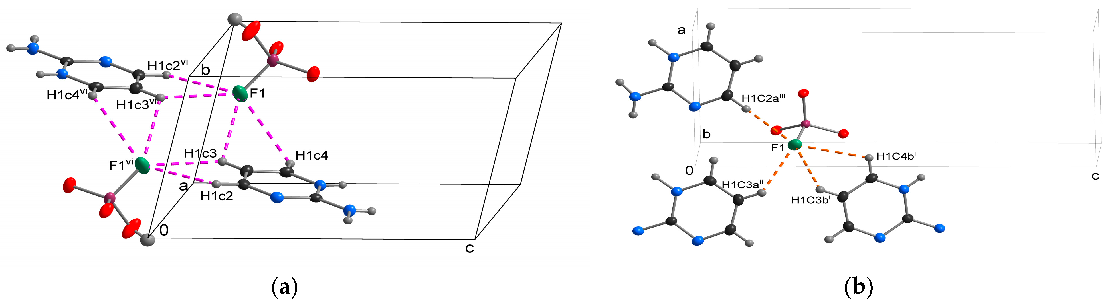 - Matulková, I.; Fábry, J.; Němec, I.; Císařová, I.; Vaněk, P. Migrating hydrogen in 2,4,6-triaminopyrimidinium(1+)x hydrogen trioxofluorophosphate(-)x monohydrate/2,4,6-triaminopyrimidinium(2+)1–x trioxofluorophosphate(2–)1–x monohydrate (0.0 < x < 0.73) with changing temperature. Acta Crystallogr. Sect. B Struct. Sci 2017, 73, 1114–1124. [Google Scholar] [CrossRef]