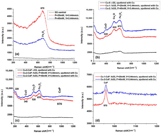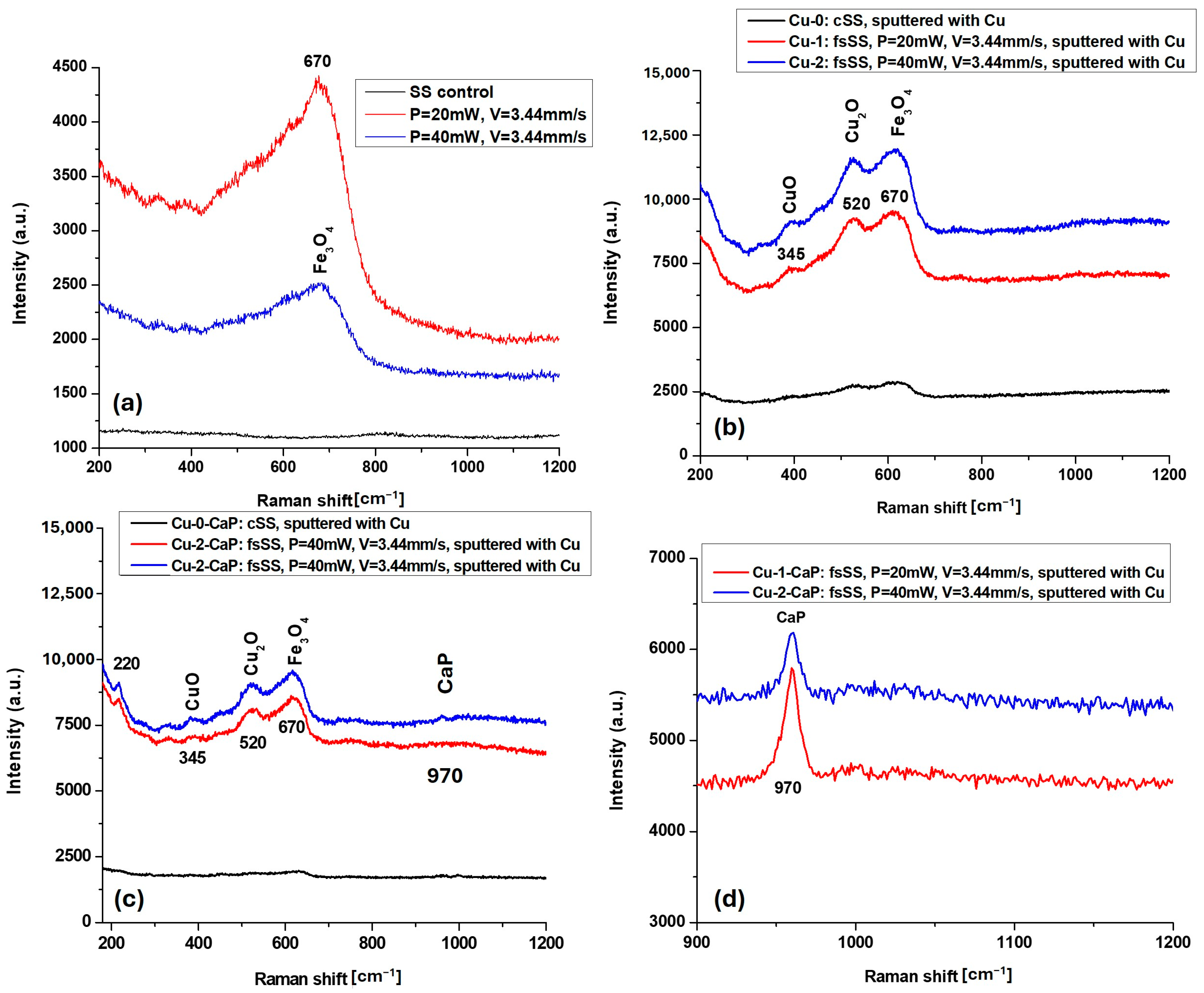 Notably, the Raman signals are more pronounced in the Cu-2 and Cu-2-CaP samples, corresponding to the second set of femtosecond laser parameters used for LIPPS generation on SS surfaces (Figure 4b,c). This enhancement can be attributed to increased surface oxidation induced by femtosecond laser treatment performed at higher power, which promotes the formation of oxidized species of Fe (Fe3O4) and Cu (CuO, Cu2O). Such features are not observed in control SS samples, whether sputtered or unsputtered (cSS, Cu-0, and Cu-0-CaP), highlighting the influence of laser-induced surface modification on subsequent oxidation and crystal growth.