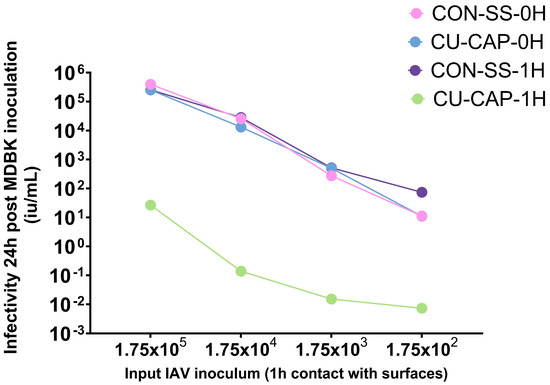 Viral infectivity of MDBK cells measured 24 h post-inoculation using a NanoLuc reporter virus system and expressed in infectious units per milliliter (IU/mL), calculated via a standard curve. Cu-CaP-1H—copper/calcium phosphate-treated stainless steel and CON-SS-1H—untreated stainless steel with 1 h viral exposure. Cu-CaP-0H and CON-SS-0H—back reference controls.