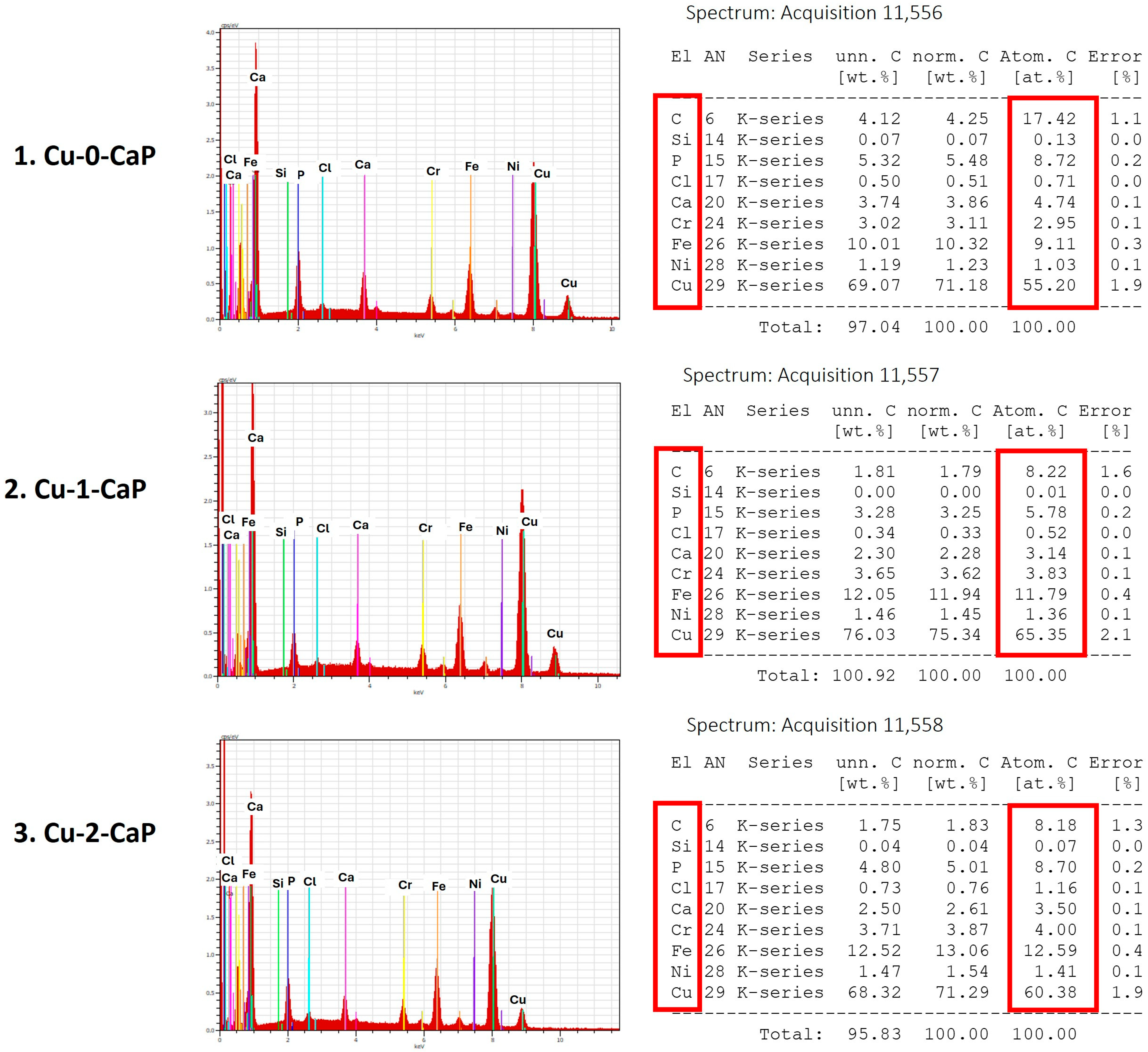 Figure 3. EDX spectra and elemental composition (at.%) of: 1. Cu-0-CaP (first line); 2. Cu-1-CaP (second line); and 3. Cu-2-CaP SS (third line) samples.