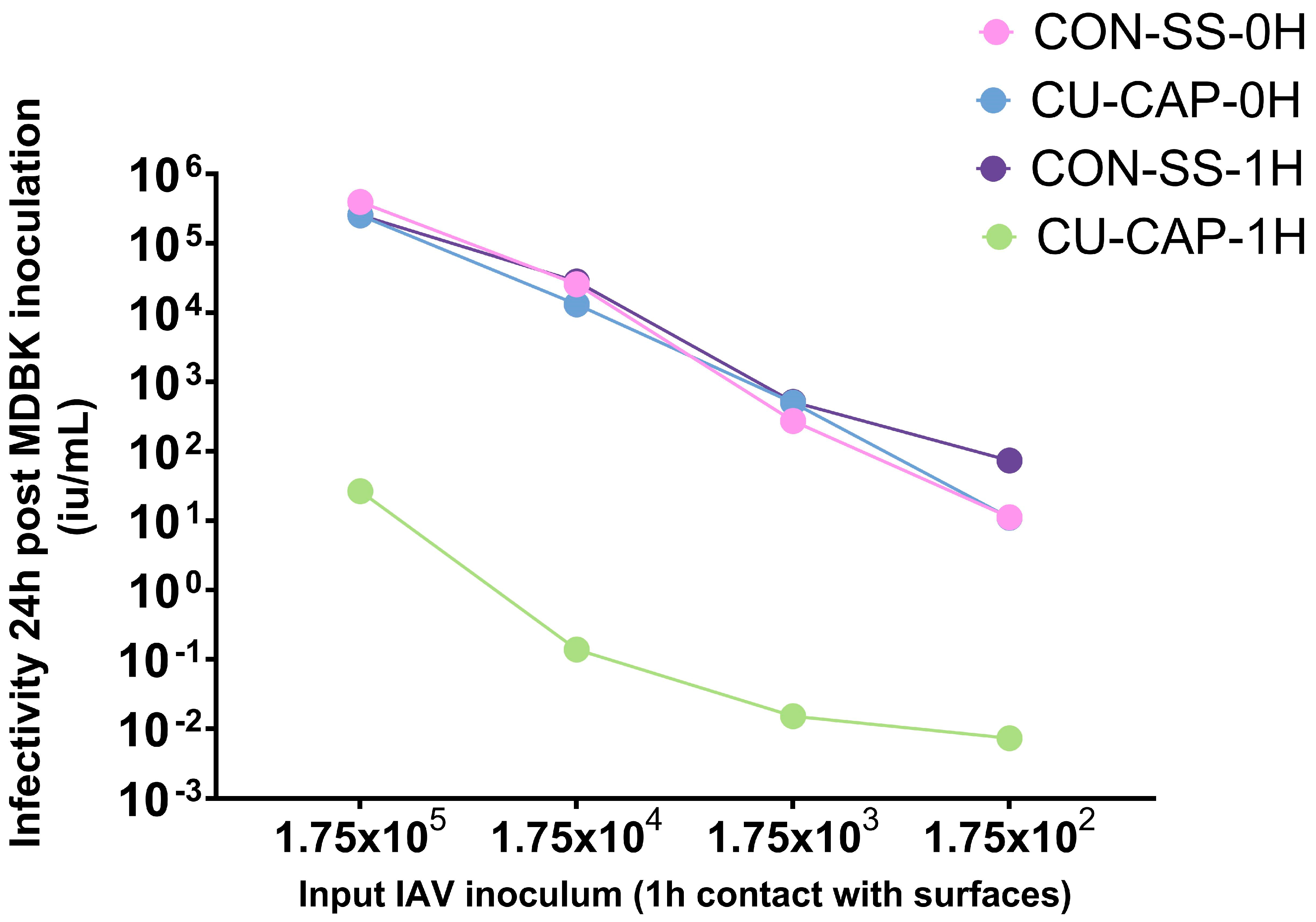 Figure 5. Viral infectivity of MDBK cells measured 24 h post-inoculation using a NanoLuc reporter virus system and expressed in infectious units per milliliter (IU/mL), calculated via a standard curve. Cu-CaP-1H—copper/calcium phosphate-treated stainless steel and CON-SS-1H—untreated stainless steel with 1 h viral exposure. Cu-CaP-0H and CON-SS-0H—back reference controls.