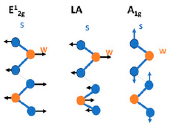 The most prominent Raman bands of WS2 are the E12g and A1g modes which are associated with in-plane and out-of-plane vibrations of W and S atoms. These two main vibrations are characteristic of layered transition metal dichalcogenides with a hexagonal structure. The E12g band corresponds to the in-plane vibrations of sulfur and tungsten atoms in the layer, where the metal and chalcogen atoms vibrate in opposite directions. The frequency of the E12g vibrations varies depending on the number of layers of the material. In the WS2 monolayer, the E12g mode is located at approximately 356 cm−1. The A1g mode represents oscillations of sulfur atoms that move perpendicular to the plane and out of plane, whereas the tungsten atoms remain relatively motionless at the equilibrium position (see Figure 1) [1,2,3,4,5]. Position of the A1g band peak is also sensitive to the number of layers of WS2; for example, in a monolayer, it is located at approximately 418 cm−1, while in thicker layers, it shifts to higher wavenumber values. This shift is due to interactions between the layers of the material. The difference between both peaks serves as a sensitive indicator of the number of layers and interlayer interactions of WS2. It has been found experimentally [6] that when WS2 is a monolayer material, the difference between the dominant bands is less than ~60 cm−1. In addition to the bands with E12g and A1g peaks, the Raman spectrum of WS2 also contains higher-order vibrational modes, namely 2LA(M) and 2LA(T) [7]. Similar Raman features are also found in other layered transition metal dichalcogenides, such as WSe2 and MoS2. The main difference in the Raman spectra of WS2, WSe2 and MoS2 is the number and position of their characteristic peaks. MoS2 typically exhibits two prominent peaks, the in-plane E12g mode around 383 cm−1 and the out-of-plane A1g mode around 407 cm−1. In contrast, WSe2 exhibits more peaks in its first-order spectrum, peaks located around 137 and 248 cm−1 and mode A1g around 251 cm−1. The position of the single peak in few-layer samples of WSe2 shifts with the number of layers, unlike MoS2, which exhibits a clear evolution in the spacing between its two main modes [3,8,9,10].