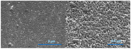 The nanostructured WS2 films were formed by sputtering WS2 stoichiometric bodies of 14 nm, 30 nm and 45 nm thickness and by sulfurization under the same conditions for all samples listed in Table 1. Figure 2, Figure 3 and Figure 4 show the morphologies of nanostructured WS2 films using FESEM. In Figure 2, a discontinuous seed layer of crystals is seen. We estimate that WS2 of thickness 14 nm contains 20 layers [14]. In Figure 3, growing crystals are clearly visible, and in Figure 4, a flake nanostructure of WS2 is developed. The WS2 flakes are not uniformly distributed and are differently oriented. WS2 crystals have strong in-plane chemical bonds but weak interplanar bonds, so they can form nanoflakes or nanolayers that are nanometers thick in one direction but can be micrometers wide and their active surface area can exceed 1000 square meters per gram [1,15].