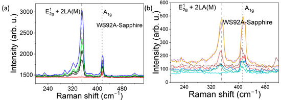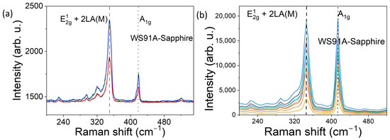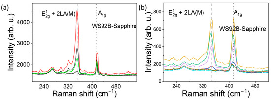 Raman spectra of WS92A (200–540 cm−1) from multiple surface spots of a 14 nm WS2 film: (a) five spots under 532 nm excitation; (b) seven spots under 632.8 nm He–Ne excitation.
