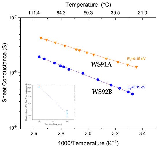 Arrhenius plot of two samples of WS2 (WS91A and WS92B). Inset: x-axis is linear scale of deposition time in minutes, y-axis is at logarithmic scale of sheet resistance in Ω/□.
