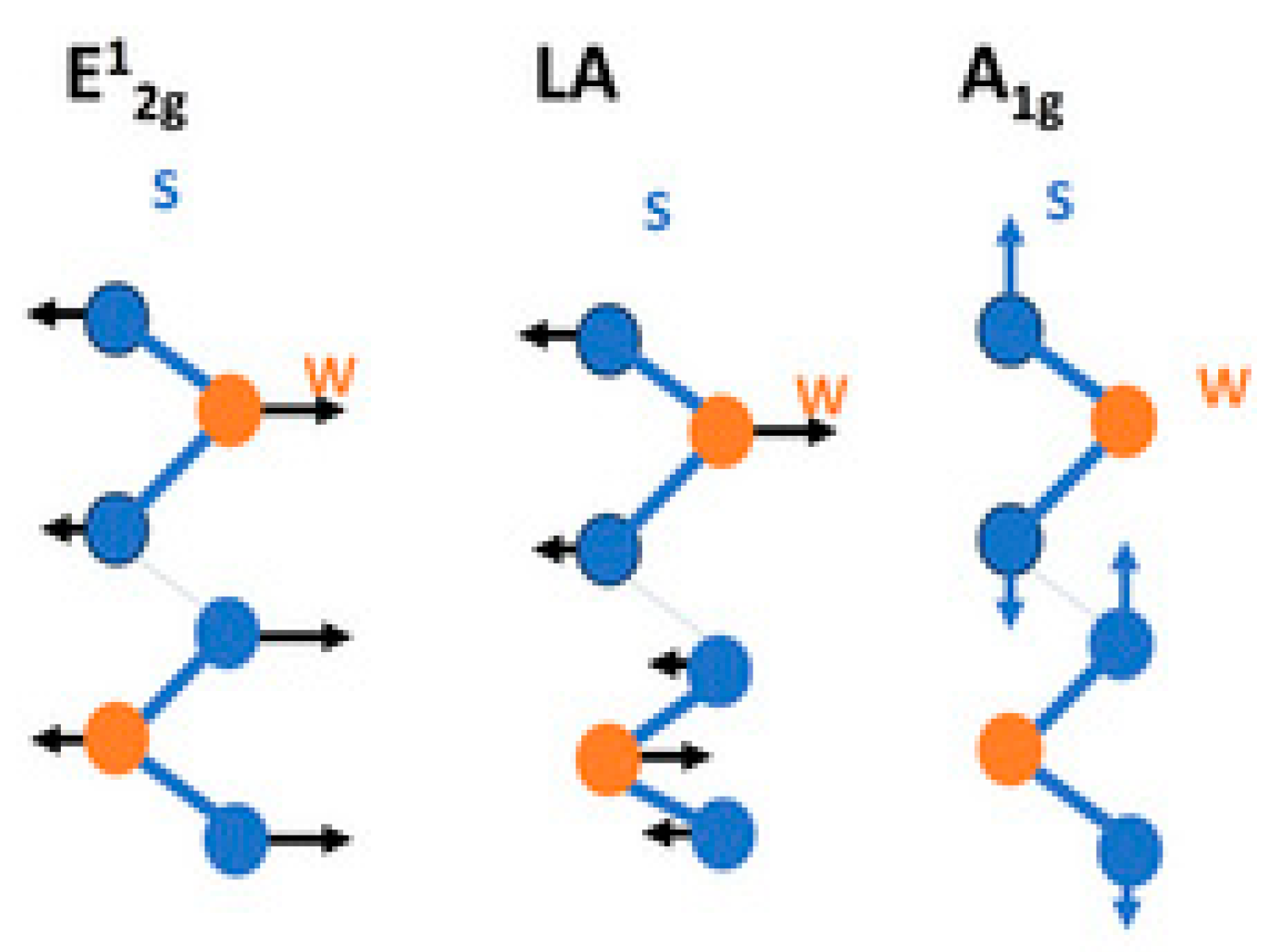 - Zhao, W.; Ghorannevis, Z.; Amara, K.K.; Pang, J.R.; Toh, M.; Zhang, X.; Kloc, C.; Tane, P.H.; Eda, G. Lattice dynamics in mono- and few-layer sheets of WS2 and WSe2. Nanoscale 2013, 5, 9677–9683. Available online: https://pubs.rsc.org/en/content/articlelanding/2013/nr/c3nr03052k (accessed on 1 October 2025). [CrossRef] [PubMed]