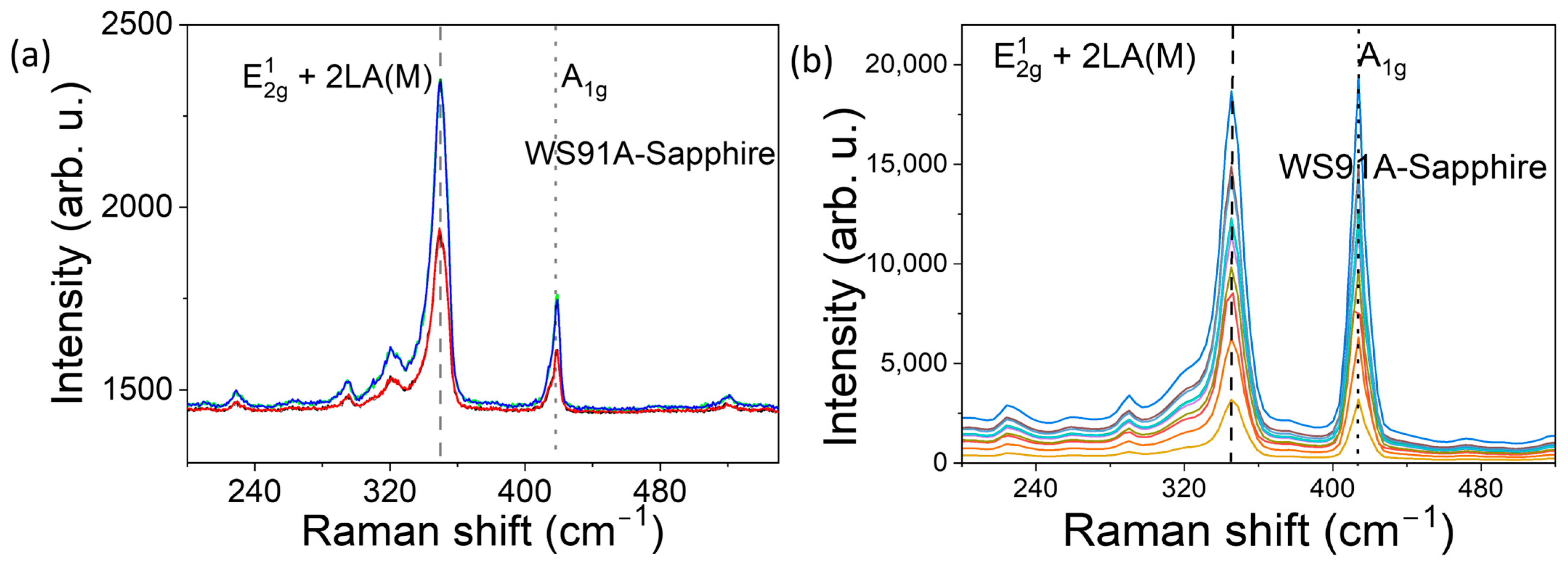 - Rajeswaran, B.; Konar, R.; Yitzhari, R.; Nessim, G.D.; Tischler, Y.R. Enhancement of the E12g and A1g Raman modes and layer identification of 2H-WS2 nanosheets with metal coatings. J. Raman Spectrosc. 2023, 54, 1030–1037. [Google Scholar] [CrossRef]