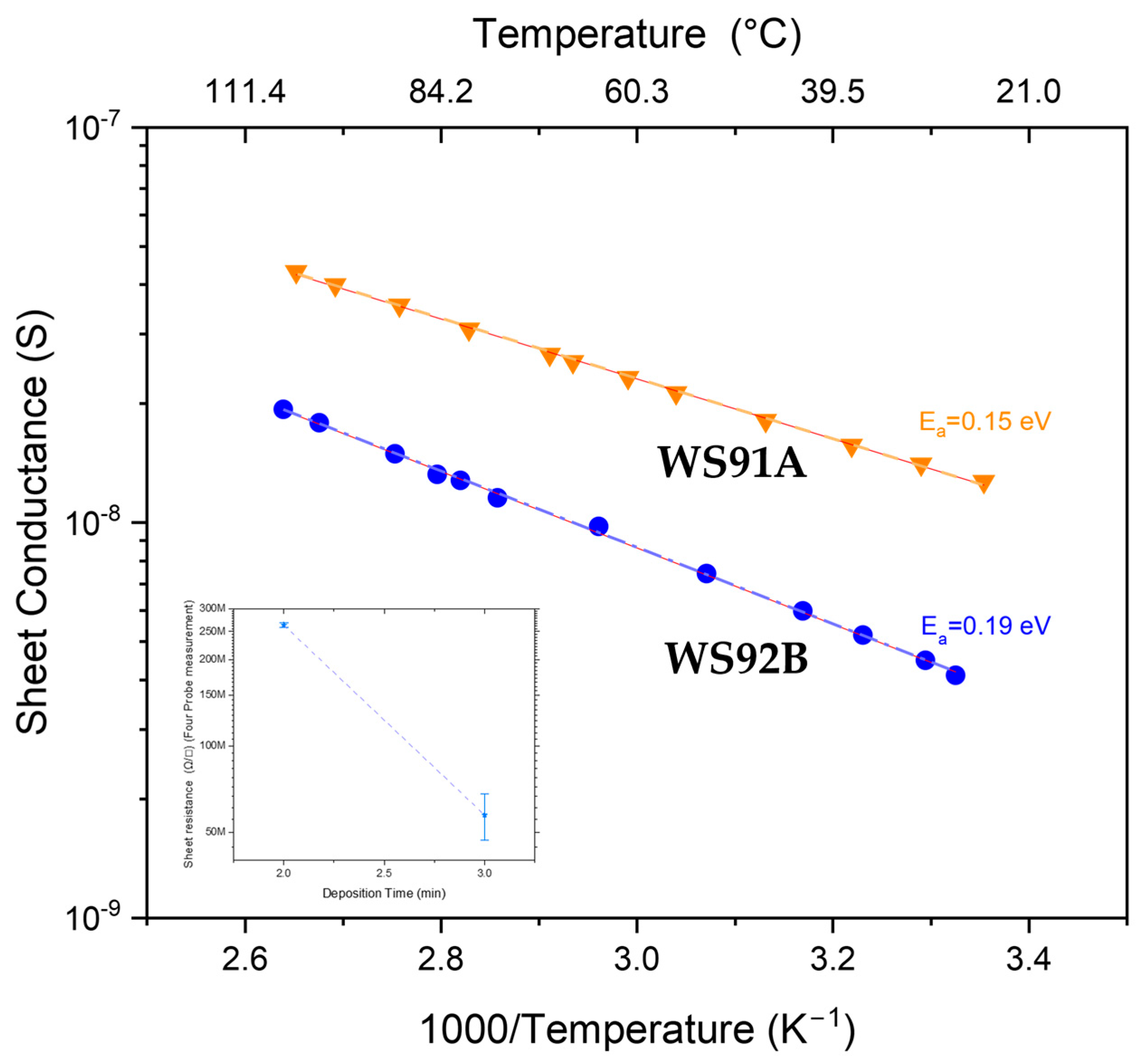 | Identification of WS2 Samples | Deposition Time | Sheet Resistance (Four Probes Method) | Activation Energies (eV) | |