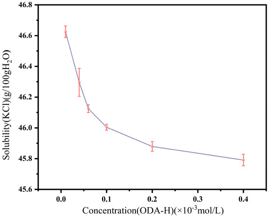 In this study, we chose relatively low concentrations of ODA-H as experimental variables, primarily because the critical micelle concentration (CMC) of ODA-H is only approximately 4 × 10−5 mol/L under high ionic strength. The primary purpose of this experiment is to obtain basic quantitative data on crystallization, ensuring precise control over the critical conditions for solid precipitation from the solution and avoiding arbitrariness in the experiment. Experiments were conducted to determine the solubility of KCl in systems with different ODA-H concentrations at a constant temperature of 70 °C, and the results are presented in Figure 1. The experimental data indicate that with increasing ODA-H concentration, the solubility of KCl in the system exhibits a gradual decreasing trend. To ensure that KCl could be completely dissolved and ODA-H would not precipitate at 70 °C within the ODA-H concentration range selected in this study, an initial KCl feeding ratio of 41.25 g KCl per 100 g H2O was finally determined.