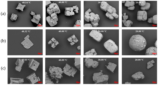The effect of ODA-H on the growth of KCl crystals under the experimental conditions of a rotation speed of 500 rpm and a cooling rate of 15 min/°C is shown in Figure 2. The concentration gradients of ODA-H set in the experiment are 0 mol/L (blank control group), 4 × 10−5 mol/L, and 1 × 10−4 mol/L. The setting of these concentration gradients is based on the critical micelle concentration (CMC) characteristics of ODA-H—its critical micelle concentration range is approximately 4 × 10−5~6 × 10−5 mol/L. By covering the concentration intervals of “blank control—close to the lower limit of CMC—higher than the CMC range”, the differential regulatory effects on the growth process of KCl crystals can be systematically explored in the stages of no micelle formation, initial stage of critical micelle formation, and stable existence of micelles.