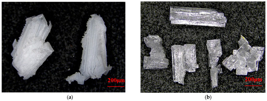 The effect of stirring speed on KCl crystal products is presented in Figure 4. As the stirring speed increases, the KCl crystal products gradually form monodisperse particles or dimeric ellipsoidal particles—dark lines observable inside the crystals under a microscope allow for the identification of grain boundaries. With a further increase in stirring speed, the burrs on the surface of KCl crystals gradually diminish; this reduction in surface irregularities effectively decreases the specific surface area of the crystal particles. In turn, fewer specific surface area sites are available for the adsorption of residual ODA-H, thereby contributing to enhanced product purity. However, subsequent experiments have demonstrated that this dispersion state (and the associated ellipsoidal morphology) can also lead to impurity entrapment within the crystal structure.
