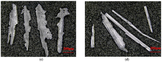 The addition of ODA-H alters the morphology of subcrystals, thereby influencing the morphology of the final crystalline product. The effect of ODA-H on the growth of KCl crystals under the condition of no flow field is shown in Figure 3. In the system without the addition of ODA-H, KCl crystals grow in a flaky form, and there are obvious overlapping and agglomeration phenomena between the flakes. With the increase in the concentration of ODA-H, the lateral growth of the crystals is significantly inhibited, and the lateral size of the crystals gradually decreases. At the same time, the edge regions of the long crystals have the characteristics of the growth of independent small crystal edges accompanied by multistage crystal clusters. When the concentration of ODA-H is further increased, the narrowing trend of the crystals intensifies: when the concentration increases to 6 × 10−5 mol/L, feathery KCl crystals can be observed; when the concentration increases to 8 × 10−5 mol/L, the KCl crystals show a typical acicular habit. Given that the core objective of this study is to develop a preparation process for high-purity KCl, and due to the limitations of the article’s length, the in-depth research results on the mechanism of action of ODA-H on the growth behavior of each crystal face of KCl will be elaborated in detail in subsequent work.