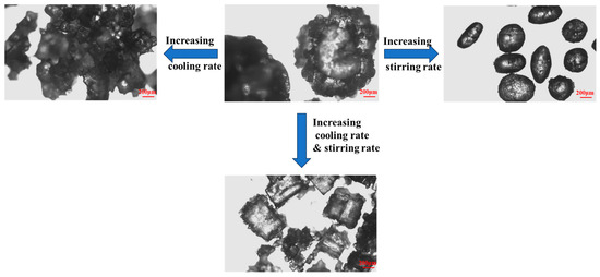 The cooling rate is a key factor affecting the morphology of KCl crystals. Figure 4 intuitively shows the differences in crystal morphology corresponding to different cooling rates under the condition of a stirring speed of 400 rpm. The experimental results indicate that the faster the cooling rate, the more difficult it is for the crystal particles to form a spherical structure. In scenarios where the concentration of ODA-H is low, it can be observed that the initial growth of the crystals exhibits a radial characteristic from the center to the outside, and the overall particles have a loose texture. When the cooling rate decreases, the gaps between the branches formed by radial growth are gradually filled by the subsequently growing crystals, eventually forming spherical particles with a more compact structure.