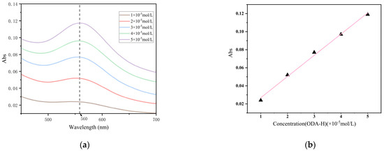 We used the ultraviolet spectrophotometric method to detect the ODA content [25]. First, wavelength scanning was performed on the prepared ODA-H standard solutions, and the maximum absorption wavelength (corresponding to the highest absorbance) was found to be approximately 560 nm, as presented in Figure 6a. Subsequently, the absorbance values of each ODA-H standard solution at this maximum absorption wavelength were measured and are listed in Table 1. Using the ODA-H standard concentration as the abscissa and the corresponding absorbance value as the ordinate, a standard curve was constructed via linear regression analysis, as shown in Figure 6b. This linear regression yielded a fitted line with a slope of 0.0235, an intercept of 0.0033, and a correlation coefficient (R2) of 0.99654.