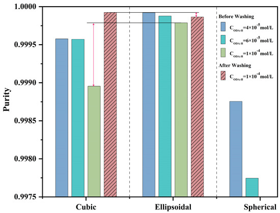Experimental results indicated that without washing, among all parallel experimental groups, ellipsoidal KCl particles exhibited the highest purity—consistent with the initial hypothesis, as shown in Figure 7. Their lower specific surface area reduced the adsorption of residual ODA-H on the KCl crystal surface, thereby enhancing product purity. Notably, the purity of large spherical KCl particles was the lowest, contrary to their theoretically expected smaller specific surface area. Via optical microscopy observation and scanning electron microscopy (SEM) characterization, it was found that the surface of large spherical particles was rough with more step structures—a structural feature that actually increased their specific surface area. Furthermore, large spherical particles were formed by the agglomeration of small KCl particles, with a complex internal structure consisting of agglomerates and multi-level crystal clusters. This structure easily resulted in severe impurity entrapment—specifically, residual ODA-H being encapsulated within the crystal particles—ultimately further lowering purity. The dimeric ellipsoidal crystal products further validated this phenomenon. After washing, monodisperse square KCl particles exhibited the greatest purity improvement, with their final purity surpassing that of washed ellipsoidal KCl particles. The most notable difference between these two crystal types was the presence of grain boundaries in ellipsoidal KCl particles—a key factor contributing to impurity entrapment.