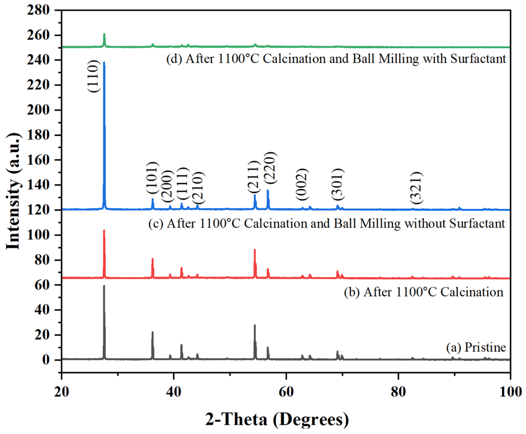 | Calcination Temperature (°C) | Measured Density (g/cm3) | Surfactant Present During High-Energy Ball-Milling | Avg Particle Size (µm) | a (Å) | b (Å) | c (Å) | V (Å3) | Phase | Crystal Structure |