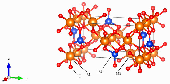 Olivine, one of the simplest silicate minerals, is a crucial rock-forming component of both terrestrial mafic-ultramafic rocks and extraterrestrial materials. As a typical orthorhombic orthosilicate (space group Pbnm) (Figure 1), Olivine [(Mg,Fe)2SiO4] forms a complete solid solution series between its end-members-forsterite (a = 4.75 Å, b = 10.20 Å, c = 5.98 Å) and fayalite (a = 4.82 Å, b = 10.48 Å, c = 6.09 Å) [10]—and typically incorporates minor substitute cations including Mn and Ni. The crystal structure of olivine consists of isolated SiO4 tetrahedra bridged by Mg2+ and Fe2+ cations. Within this framework, each silicon ion (Si4+) forms stable tetrahedral coordination with four oxygen ions (O2−), with the overall O2− framework adopting a distorted hexagonal close-packed arrangement. Si4+ ions occupy 1/8 of the tetrahedral voids within this structure. The Mg2+ and Fe2+ cations fully occupy two distinct octahedral sites, M1 and M2. The M1 site, located on an inversion center, forms a relatively regular octahedron. In contrast, the M2 site, situated on a mirror plane, exhibits a greater degree of distortion, reflected in the larger variance of its M–O bond lengths [11,12,13,14].