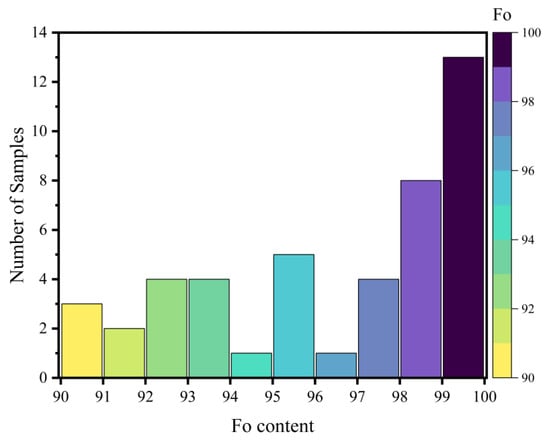 The chemical composition of olivine grains was analyzed using a SHIMADZU EPMA-1720 wavelength-dispersive electron microprobe (Shimadzu Corporation, Tokyo, Japan) at the Electron Probe Laboratory, China University of Geosciences (Beijing). Operating conditions were as follows: beam current of 10 nA, accelerating voltage of 15 kV, excitation time of 10 s, excitation beam spot diameter of 5 µm. The instrument was calibrated using 52 standard minerals from the SPI Supplies (West Chester, PA, USA), and the correction method employed was ZAF 3. All analyzed spots were positioned at the core of the olivine grains to ensure compositional representativeness. The obtained chemical compositions are presented in Table A1 (Appendix A). The corresponding cation numbers, calculated on the basis of 4 oxygen atoms, and the resulting forsterite (Fo = 100 × Mg/(Mg + Fetotal) in molar basis) contents are compiled in Table A2 (Appendix A). The forsterite content of the 45 analyzed olivines ranges from 90.00 to 99.86 (Figure 2). The total amount of trace components detected such as MnO, NiO and CaO in each sample was less than 1 wt%.