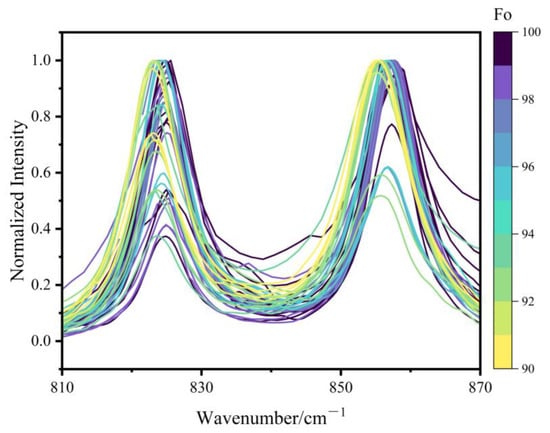 The specific assignment of Raman modes in olivine has been summarized in previous studies [11,16,25]. Figure 3 shows the characteristic doublet peaks from the 45 olivine samples in this study, clearly illustrating a systematic shift to higher wavenumbers with increasing Fo values. Specifically, the peak near 820 cm−1 shifts from 822.8 to 825.6 cm−1, while the peak near 850 cm−1 varies between 855.2 and 857.8 cm−1. The observed increase in Raman wavenumber with Mg content is attributed to the shortening of the average Si-O bond lengths and hence, stronger Si-O force constant. As Fe2+ is substituted by Mg2+, the forsterite number (Fo) increases, leading to a decrease in both the atomic mass at octahedral sites and the polyhedral volumes. The consequent shortening of M1-O and M2-O bond lengths induces positional shifts of oxygen atoms bridging SiO4 tetrahedra with M1/M2 sites [35]. This leads to shorter Si-O bonds and higher vibrational frequencies, thereby causing the observed high-wavenumber shifts in the Raman peaks. The degree of coupling between the symmetric and antisymmetric stretching modes of the SiO4 groups may also influence the Raman shifts [11,16,20,25]. In addition to the peak positions, the relative intensity of the doublet is also affected by the crystallographic orientation of the measured areas [36].