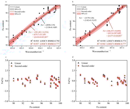 where k1, k2, k3, b1, and b2 represent the regression parameters. The detailed equations and corresponding R2 values for all models are listed in Table A4 (Appendix A). The goodness of fit for the doublet (P1 and P2) was significantly better than that for the secondary peaks (P3, P4 and P5). The R2 values for both P1 and P2 exceeded 0.93, whereas those for P3, P4, and P5 were substantially lower, generally below 0.80 (P3: 0.561–0.657; P4: 0.755–0.783; P5: 0.776–0.781), indicating relatively weak correlation. Consequently, we recommend that the doublet be prioritized for subsequent quantitative analyses, while the secondary peaks may serve as supplementary indicators. Both linear and quadratic regressions revealed strong correlations between Fo content and the doublet positions (Figure 5a,b). Notably, the goodness of fit for P2 (R2 = 0.938–0.942) were marginally better than those for P1 (R2 = 0.935–0.940). Furthermore, the quadratic model exhibited better performance than the linear model for both peaks.
