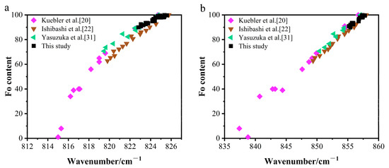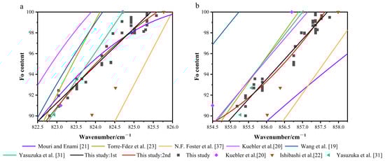 Raman doublet peak positions versus Fo content. (a) The 815–826 cm−1 peak versus Fo content. (b) The 837–858 cm−1 peak versus Fo content. Data sources: This study, Kuebler et al., Yasuzuka et al., Ishibashi et al. [20,22,31].