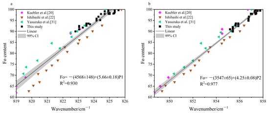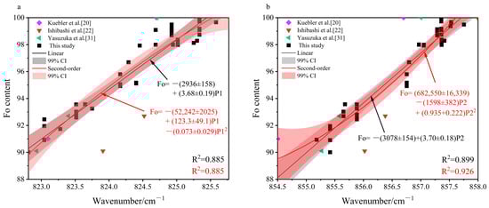 We denote these five peaks as P1 (815–825 cm−1), P2 (838–857 cm−1), P3 (881–883 cm−1), P4 (918–921 cm−1), and P5 (962–967 cm−1). Both linear and quadratic fittings were applied to the relationship between the position of each peak (Pi) and the Fo content. The general expressions for the regression models, established using the least-squares method, are as follows: