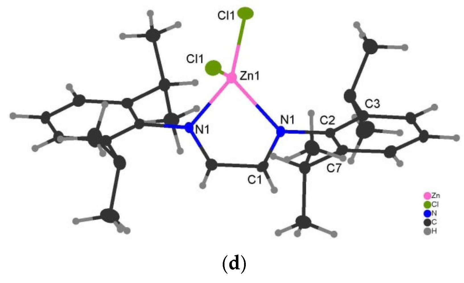 | Zn–X | 2.5419(4) | 2.5285(9) | 2.4691(8), 2.5213(7) | 2.1977(9) |