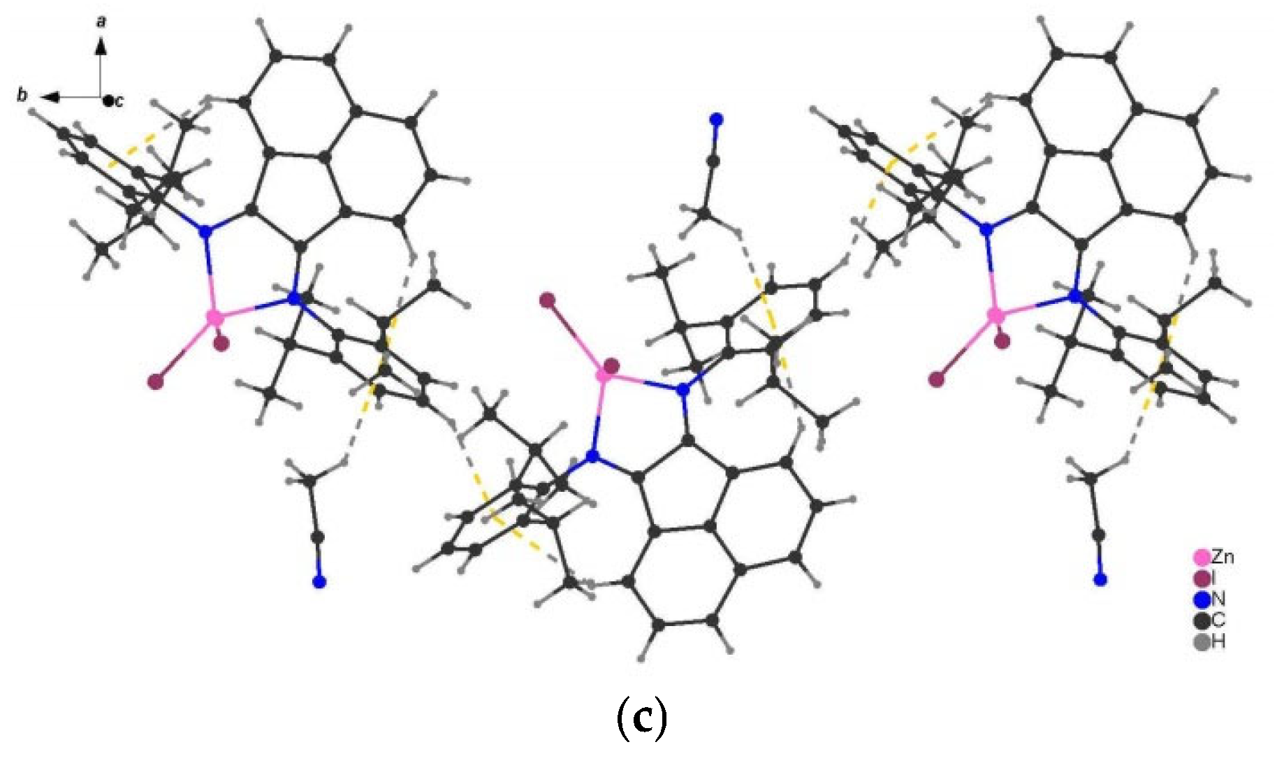 - Evans, D.A.; Lee, L.M.; Vargas-Baca, I.; Cowley, A.H. Aggregation-Induced Emission of Bis(Imino)Acenaphthene Zinc Complexes: Photophysical Tuning via Methylation of the Flanking Aryl Substituents. Organometallics 2015, 34, 2422–2428. [Google Scholar] [CrossRef]