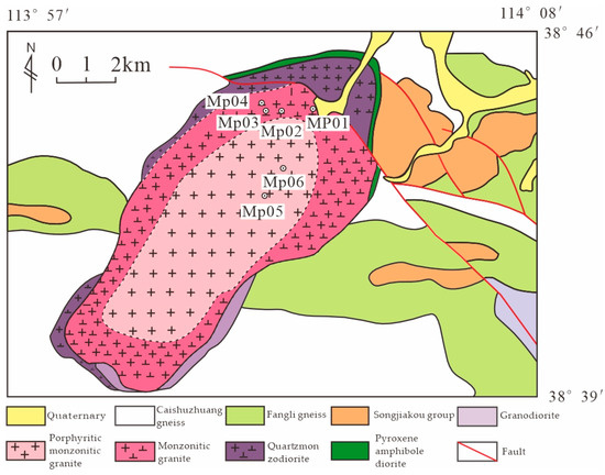 The formation of the Mapeng pluton is closely linked to the complex tectonic evolution of the North China Craton (NCC). In the early Mesozoic, the craton underwent compressional orogeny. During the Yanshanian orogeny, a series of tectonic events—including orogenesis, uplift, and associated magmatism—took place [34]. The magmatic activity and emplacement of the Mapeng pluton occurred during this period, as magma ascended along fault systems within the tectonic belt, ultimately crystallizing to form the present intrusion [26].