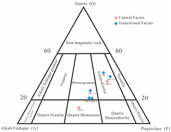 By identifying and plotting the minerals in the samples, the central facies is determined to be quartz monzonite and granodiorite, while the transitional facies consists of monzogranite and granodiorite (Table 1; Figure 3).