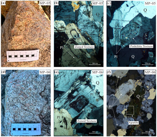 In sample MP-5, quartz appears as an anhedral granular phase, constituting around 20%, while plagioclase, in subhedral tabular forms, occupies approximately 65%. Hornblende is present in less than 3%, and plagioclase shows banding and poikilitic textures (Figure 4b,c). In sample MP-6, quartz is anhedral and accounts for about 25%, while plagioclase is subhedral and tabular, making up approximately 60%, with some plagioclase exhibiting banded structures (Figure 4e). The accessory mineral apatite is slender and prismatic, characteristic of quenching, indicating a sharp shift in physicochemical conditions during magmatic evolution (Figure 4f) [37].