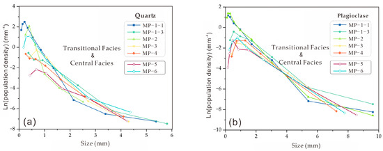 Quantitative analysis of the samples from the Mapeng rock body, including quartz and plagioclase, yields the CSD data shown in Table 2 and Table 3. The crystal size distribution (CSDs) of quartz and plagioclase are illustrated in Figure 7, with crystal size L/mm and the natural logarithm of the population density ln(n)/mm−4 [38,46].