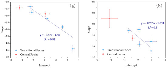 By analyzing the CSD characteristics, the mineral in the rock can be expressed as a semi-logarithmic linear relationship between the natural logarithm of the number density of grains (ln(n)) and their size (L). The slope of the semi-logarithmic curve, s(−1/Gt), is related to the growth rate (G) and crystallization time (t). The intercept is represented by ln(n0), where n0 is the final nucleation density. The 1σ values of the slope and intercept represent the uncertainties of the parameters in the ln(n)–L linear fitting, corresponding to the standard errors obtained from least-squares regression. A negative correlation between the crystal slope and intercept indicates that as the number of nuclei increases, the growth rate of the crystals decreases. This phenomenon suggests that nucleation and crystallization predominantly occur in a relatively closed system. Conversely, a positive correlation would indicate that as the number of nuclei increases, the growth rate accelerates, likely occurring in a relatively open system [40].