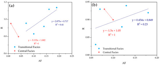 Relation diagram of quartz, orthoclase, hornblende R and AF: (a). R vs. AF diagram of quartz in the samples; (b). R vs. AF diagram of plagioclase in the samples.