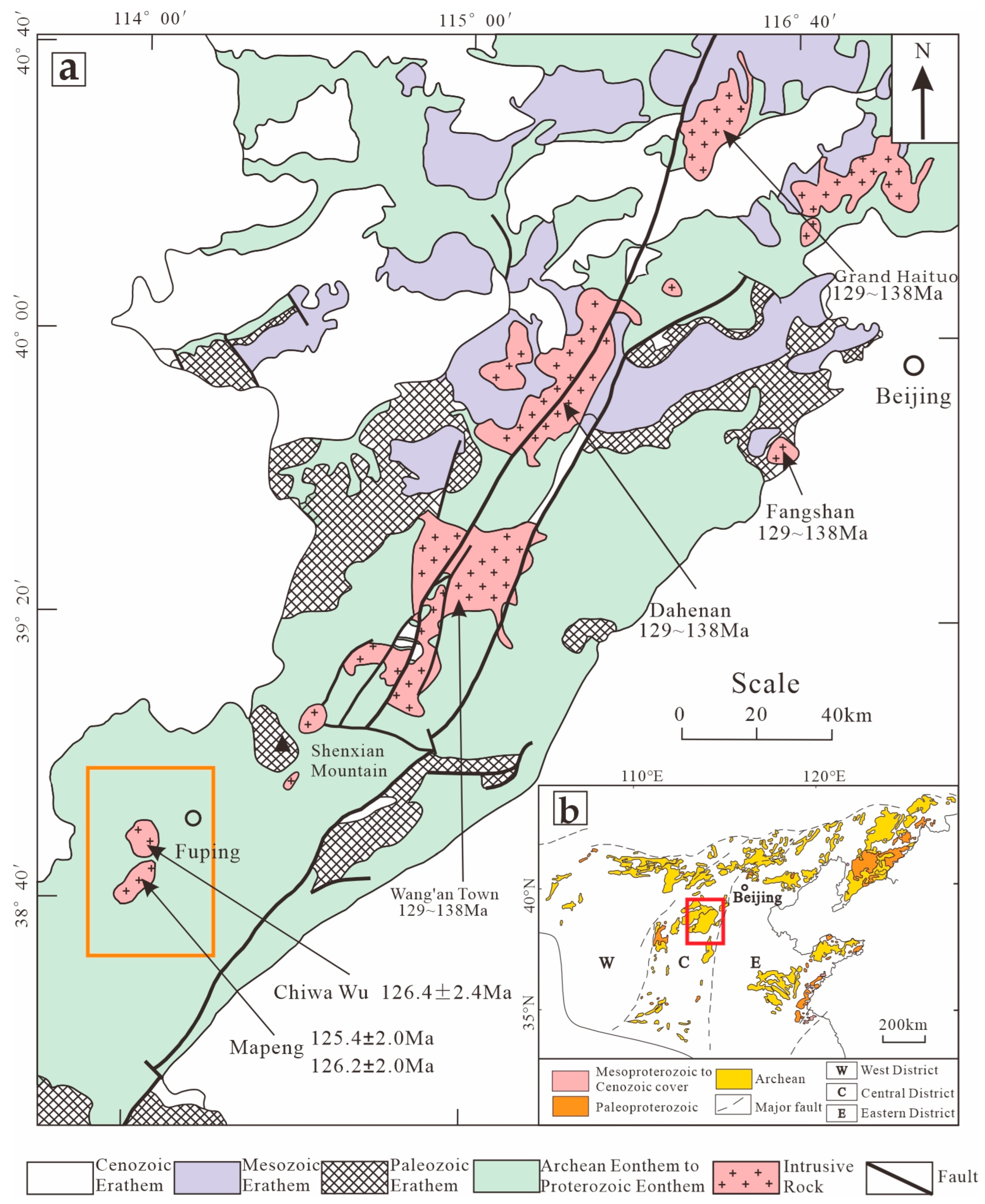 - Li, L.; Han, B.; Miao, G.; Shu, G.; Chen, J.; Yang, J.; Yang, Y.; Zhang, Y. The age, emplacement depth, and tectonic significance of the Mapeng-Chiwawu pluton in the Fuping region of the Taihang Mountains. Acta Petrol. Sin. 2012, 31, 289–306. [Google Scholar]