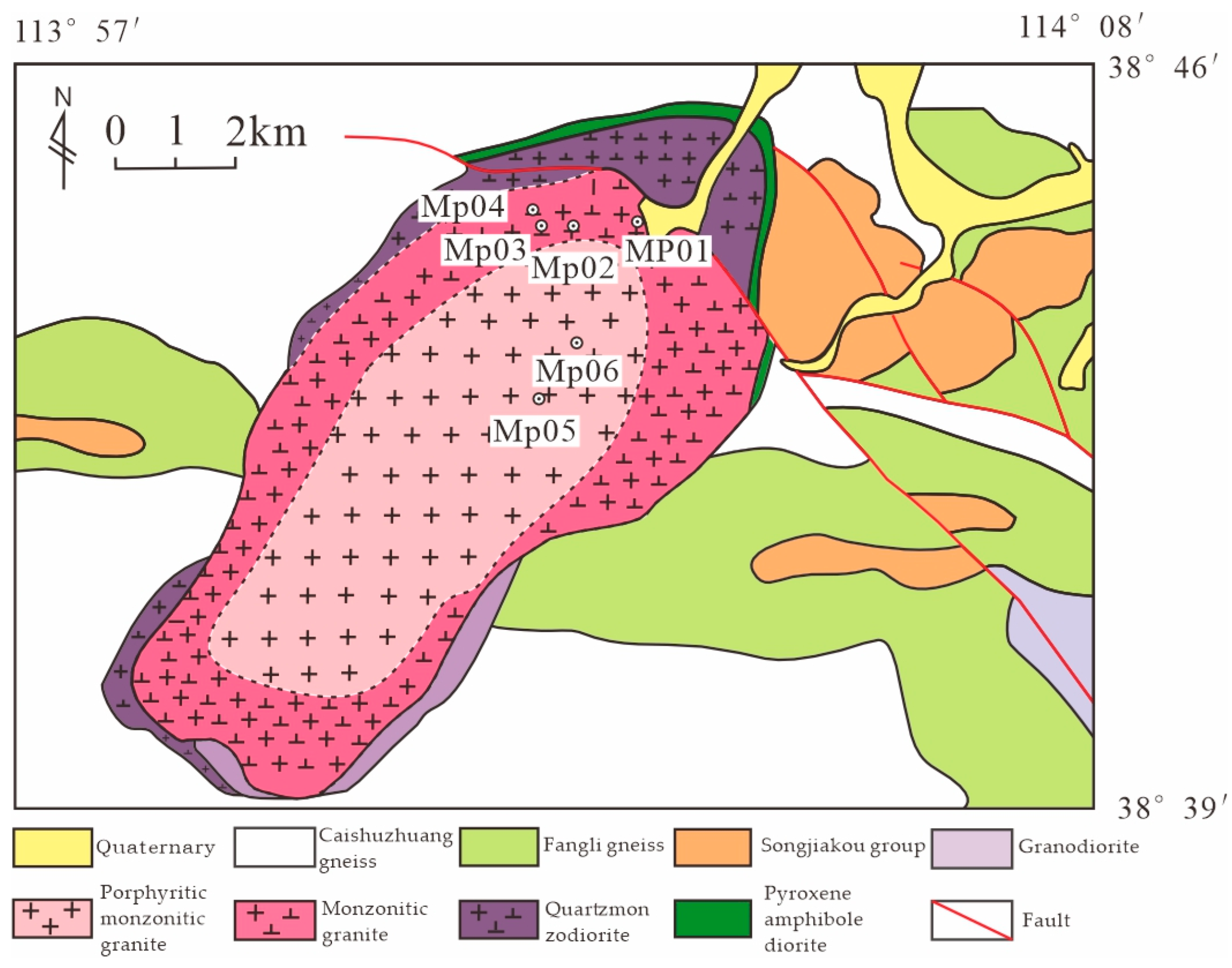 - Zhang, M. Petrogenesis and Solidification Condition of Early Cretaceous Mapeng Pluton in the North Taihang Mountain. Ph.D. Thesis, China University of Geosciences (Beijing), Beijing, China, 2020. (Chinese with English Abstract). [Google Scholar]
