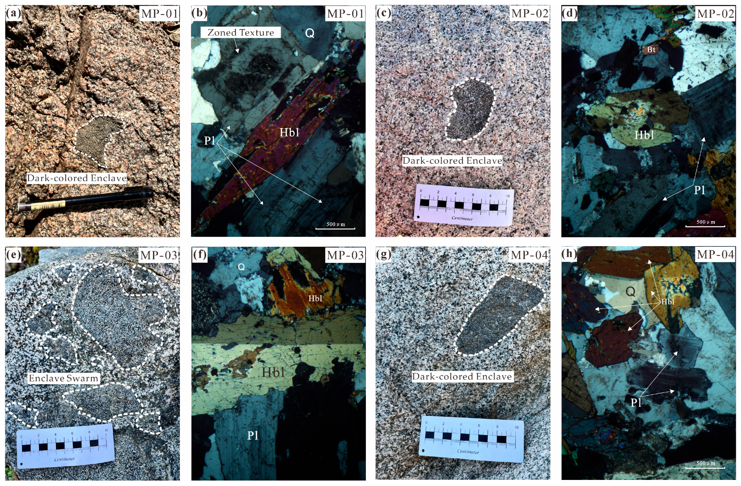 - The lithologic transition from central quartz monzonite to marginal quartz diorite indicates significant chemical zoning within the pluton. Later magma batches were relatively more mafic and enriched in Fe, Mg, and volatiles, supplying additional heat and material to the system. This multistage replenishment triggered repeated cycles of dissolution, recrystallization, and chemical re-equilibration, producing complex zoning and resorption textures that record the dynamic nature of magma mixing and recharge within the chamber.