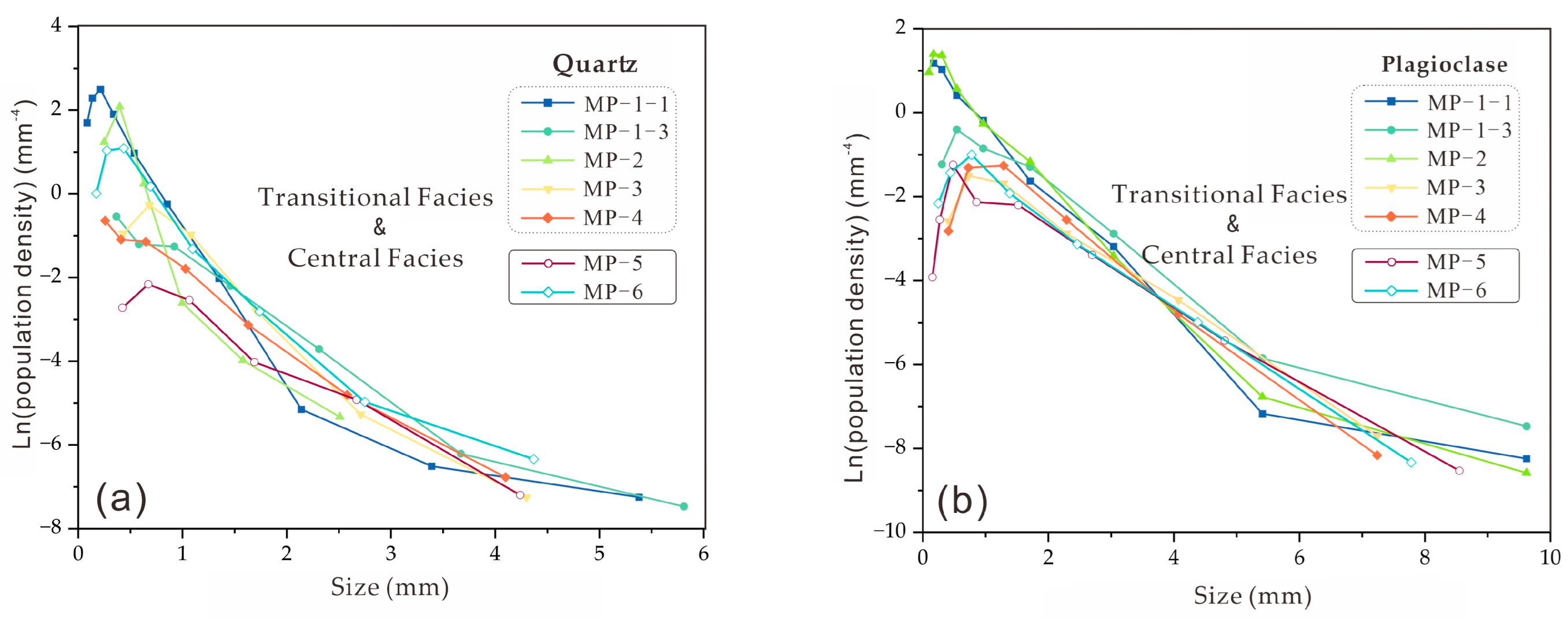 - In summary, the solidification of the Mapeng pluton was governed by the coupled effects of crystal coarsening, magma compositional contrast, and multistage replenishment. The integrated evidence from CSDs and spatial distribution parameters documents a dynamic transition from closed-system equilibrium to open-system recharge. This evolutionary pattern highlights the intricate feedbacks among thermal, compositional, and kinetic processes in the magma chamber, providing quantitative insights into the coupling between crystallization dynamics and mineralization in granitic systems.