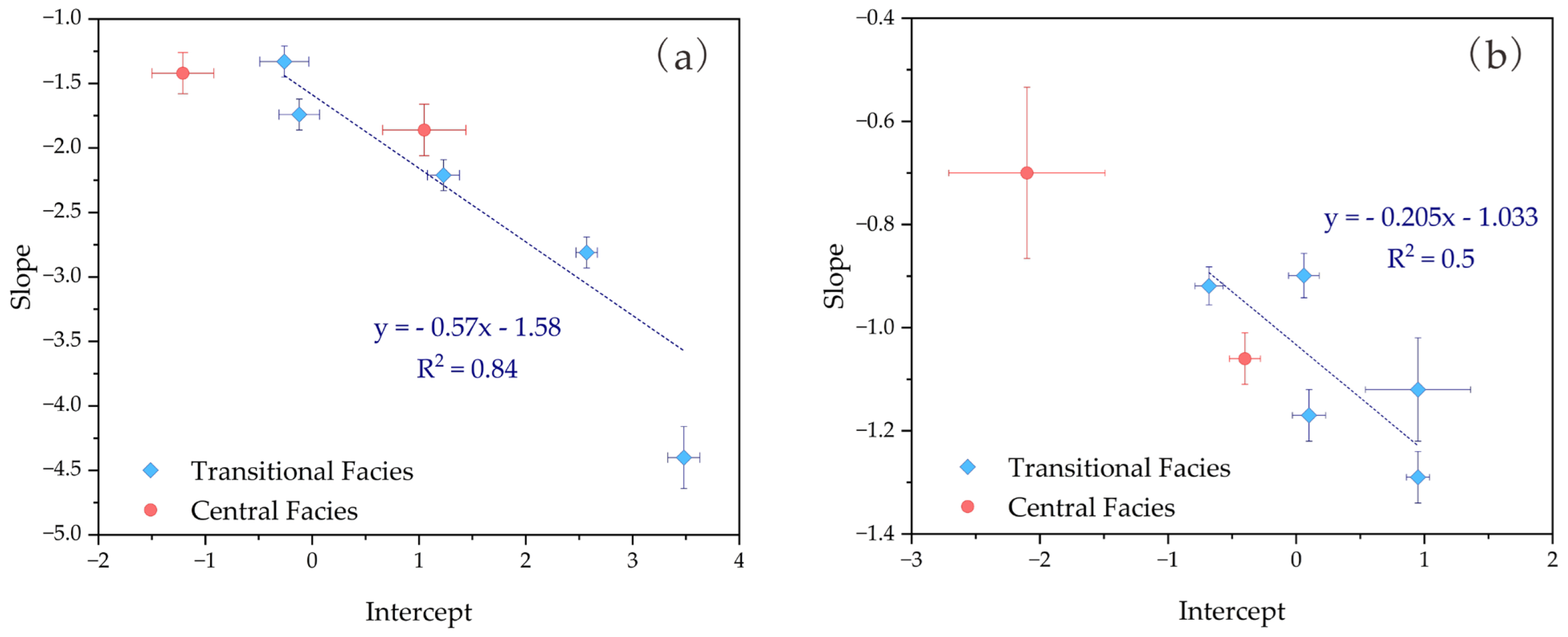 - The strong negative correlation between the slopes and intercepts of the CSD curves reveals a kinetic coupling between crystal growth and nucleation. During the early cooling phase, crystallization was dominated by nucleation, whereas in the later stage, as the system approached thermal stability, nucleation progressively ceased and crystal growth accelerated, shifting the system toward a growth-dominated regime. This negative correlation quantitatively reflects a coarsening process in which larger crystals grew at the expense of smaller ones, marking a transition toward near-equilibrium crystallization conditions.