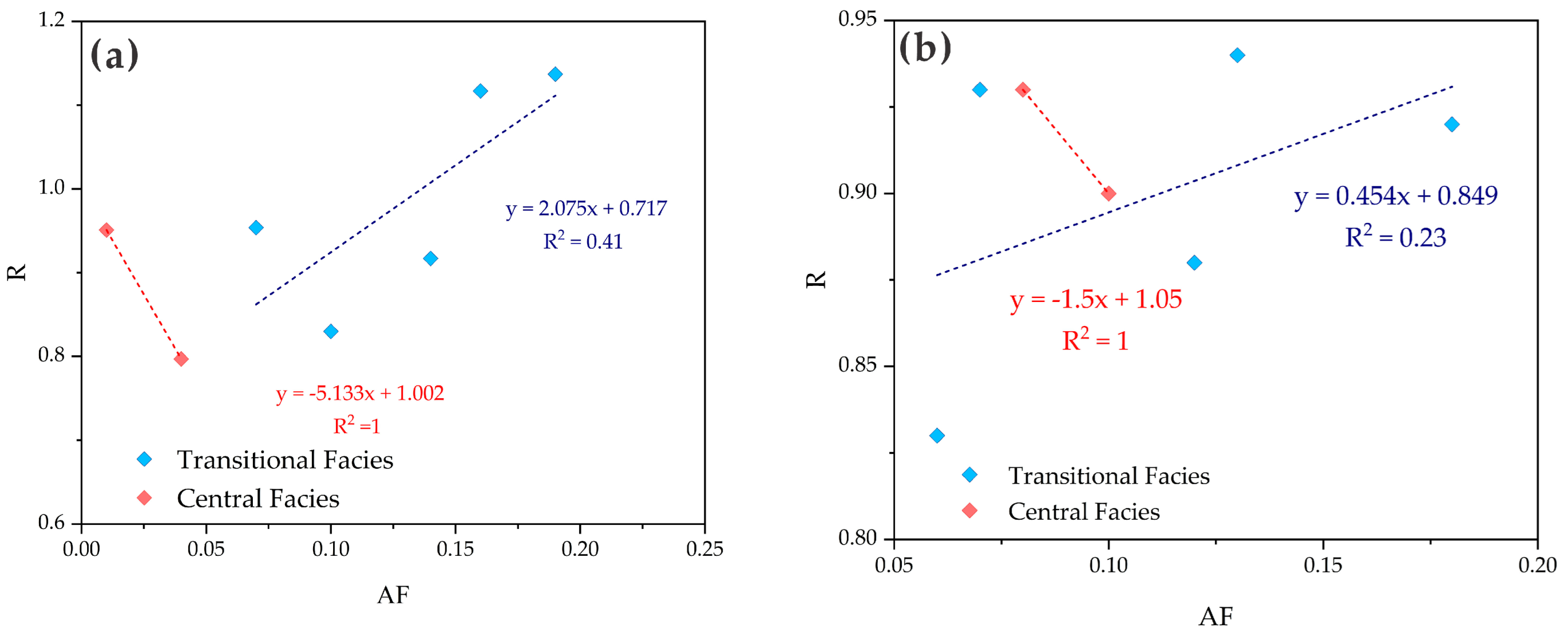 - The lithologic zoning, grain-size heterogeneity, and R–AF spatial distribution characteristics indicate that the magma chamber underwent cyclic alternations between open- and closed-system behavior. During closed-system stages, the magma cooled slowly under stable thermal conditions, promoting continuous crystal growth and coarsening. In contrast, during open-system stages, injections of hotter magma disrupted pre-existing crystallization equilibria, causing local temperature increases and chemical disequilibrium. These perturbations led to the dissolution of small crystals, accelerated growth of larger ones, and a progressive flattening of the CSD slopes.