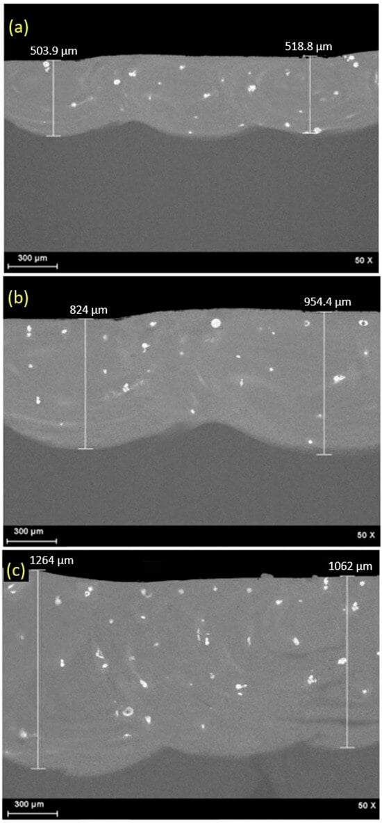 SEM images of cross-sections of the investigated samples: (a) Sample 1; (b) Sample 2, and (c) Sample 3.