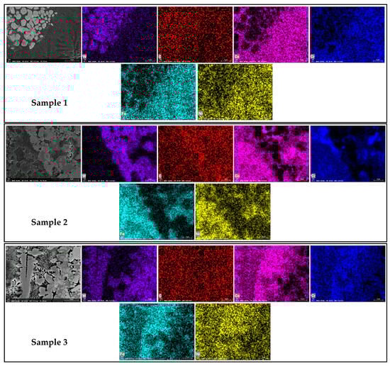 Figure 3, it can be observed that the samples exhibit a similar microstructure, which has been described previously in more detail []. The SEM micrographs and EDX mapping performed in cross-section at high magnification reveal various areas. The metallic matrix consists of a solid solution rich in Co, Cr, Fe, and Ni, with dark gray regions corresponding to Cr-rich areas. The white particles are WC, in some cases surrounded by light gray regions that represent W2C, which forms due to the partial melting of WC during laser cladding. In all cases, the morphology of WC particles appears slightly rounded, indicating partial dissolution, as described by Bolelli et al. [].