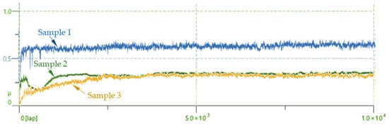 Figure 6 illustrates the corresponding wear rates for the single-layer (sample 1), double-layer (sample 2), and triple-layer (sample 3) coatings, which are 0.19, 0.16, and 0.15 × 10−8 mm3/N·m, respectively. A clear trend is observed in which wear resistance improves with increasing coating thickness. This behavior can be primarily attributed to the direct correlation between wear resistance and hardness []. Multilayer coatings typically possess a higher density of carbides and secondary hard phases within their microstructure, which not only enhances hardness but also improves load-bearing capacity and resistance to plastic deformation. Consequently, the multilayer architecture effectively mitigates material loss and contributes to superior overall tribological performance [].