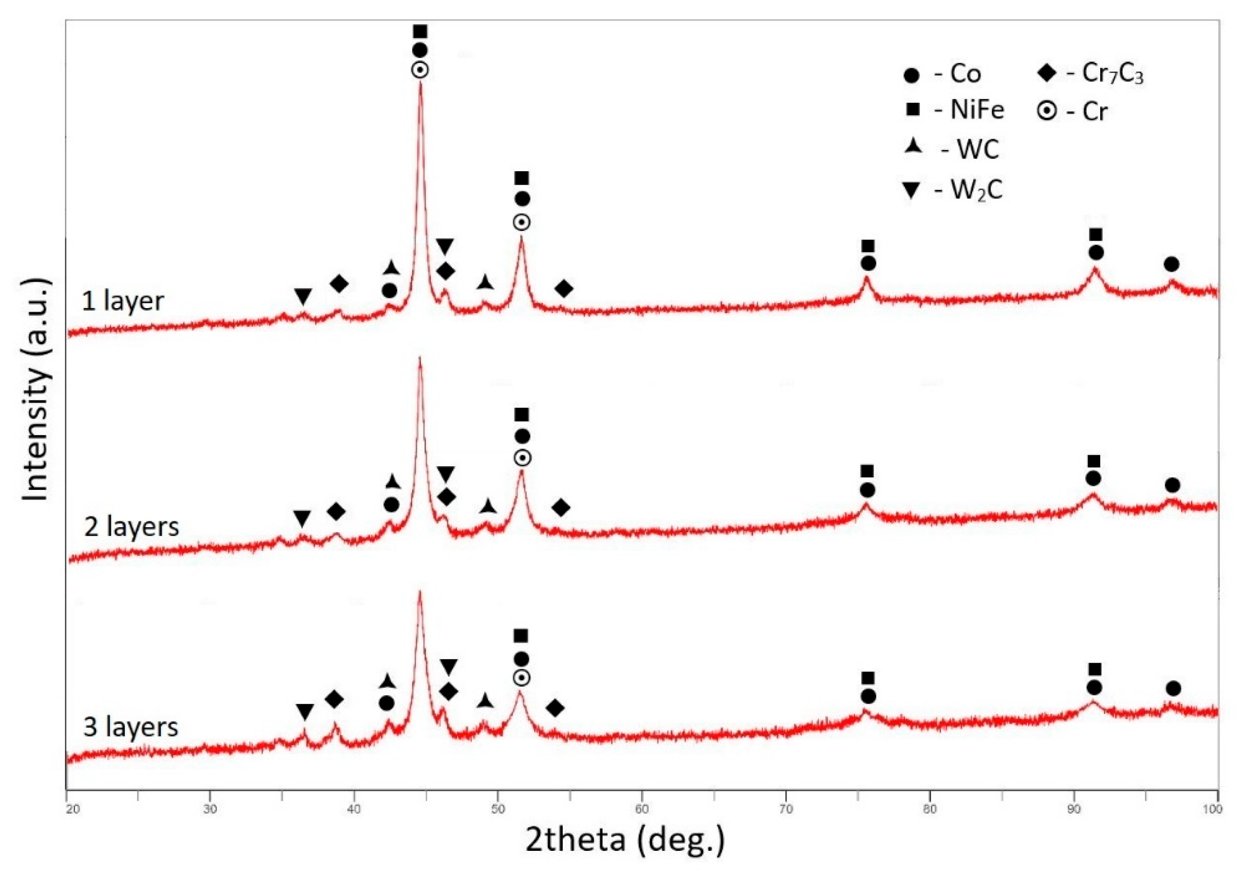 - All coatings exhibited partial decarburization of WC, leading to the formation of W2C. This phenomenon was more pronounced in the triple-layer coating due to the higher cumulative heat input.
