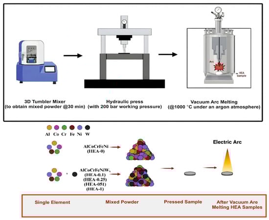 The prepared powder mixtures were blended for 30 min using a 3D Turbula mixer (ALPHIE-3, Mixer, manufactured by Hexagon Product Development Pvt Ltd. Gujarat, INDIA) to ensure homogeneous distribution. Laboratory atmospheric conditions were maintained at 23 °C with 20% relative humidity. Under the same conditions, the powders were cold-pressed into circular molds with a diameter of 20 mm under a pressure of 20 MPa. This pre-compaction step was implemented to minimize powder scattering and to improve electrical contact among the particles during the initial arc striking stage. The pressed samples were then melted in a vacuum arc melting furnace (Arc Melter AM, Edmund Bühler GmbH, Bodelshausen, Germany) under an inert argon atmosphere. Each sample was melted at least three times to achieve chemical homogeneity. The codes and chemical compositions (% molar ratio) of the produced HEAs are listed in Table 2. The flow chart of the synthesized HEA samples is presented in Figure 1.