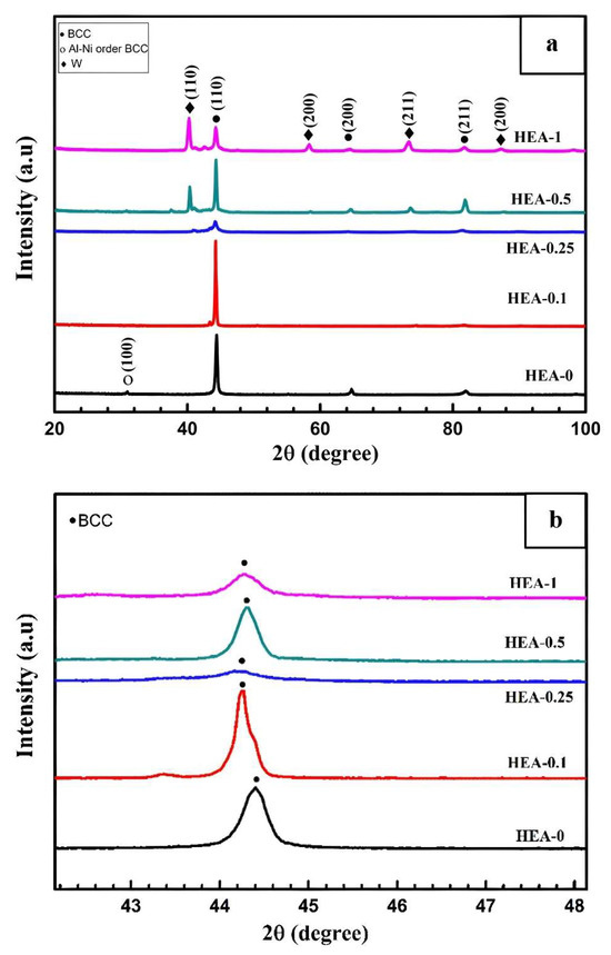 In another study on the AlCoCrFeNi2Wx HEA system, it was reported that increasing W content led to an increase in ΔHmix and Ω values, while the VEC value decreased. This observation suggests that the addition of W may promote the formation of BCC phases [38]. Similarly, in a study conducted on the AlCuCrFeMnWx HEA system, it was found that as the W content increased, the thermodynamic parameters ΔHmix, ΔSmix, ΔSconf, and Ω increased, whereas VEC and δ values decreased. Notably, the increase in ΔSconf with higher W content was interpreted as an indication that W supports the successful formation of solid solutions and enhances the high-entropy effect. Additionally, the decrease in VEC was highlighted as a factor that promotes the formation of BCC crystal structures in the presence of W [39]. Dong et al. reported that in the AlCoCrFeNiVx HEA system, increasing V content led to a decrease in VEC and δ values, which in turn stabilized the BCC solid solution phase [25]. Similarly, Jiang et al. observed that an increase in W content resulted in a decrease in the VEC value and a corresponding increase in the fraction of the BCC solid solution phase, thereby stabilizing the BCC structure [30]. In light of these findings, the experimental results obtained for the AlCoCrFeNiWx HEAs in this study are consistent with the literature in terms of solid solution phase formation. Figure 2 presents the XRD patterns of the synthesized AlCoCrFeNiWx HEAs.