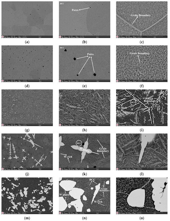 Figure 3d,g,j,m presents the SEM images of the W-alloyed HEAs. The observed microstructures are consistent with the XRD results, showing a notable reduction in grain boundary visibility with increasing W content.