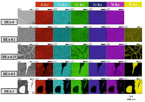 The microstructure of the HEA-0.1 alloy is similar to that of HEA-0, and the presence of dark and bright regions within the BCC grains is also evident. It can be inferred that all of the W in the HEA-0.1 alloy is dissolved within the BCC solid solution. This is supported by both the XRD pattern shown in Figure 2a and the elemental mapping analysis presented in Figure 4. Moreover, EDS analysis confirms that the bright regions contain a higher amount of W compared to the dark regions. The SEM images of the HEA-0.25 alloy (Figure 3g–i) indicate that the coexistence of dark and bright regions in the BCC matrix continues, as observed in the HEA-0 and HEA-1 alloys. In addition to this structure, the formation of a new bright phase enriched in W has also been observed. EDS and mapping analyses reveal that there is no significant chemical composition difference between the dark and bright regions within the matrix. As shown in Figure 3 j–l, the microstructure of the HEA-0.5 alloy indicates that W has reached its solid solubility limit. While a portion of W is incorporated into the BCC solid solution, the excess W precipitates as plate-shaped W-rich phases due to the solubility limit being exceeded. The microstructure of the HEA-1 alloy is presented in Figure 3m,n,o. In the HEA-0.5 alloy, white plate-shaped W phases are observed, whereas in the HEA-1 alloy, these transform into white irregular and/or suspended spherical forms. Similarly, Wu et al. reported that the microstructure of the AlCoCrFeNiW alloy contains white, suspended spherical or near-spherical W-enriched particles, which were identified as characteristic W phases [20].