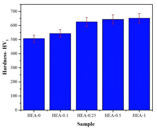 Microhardness measurements of the HEAs were performed on their microstructures. In HEA-0.5 and HEA-1 alloys, hardness measurements were deliberately avoided in regions containing plate-shaped and spherical W-rich phases, as these regions contain more than 95% tungsten and would directly influence the results. The hardness values of the HEAs are presented in Figure 5. The HEA-0 alloy exhibited a hardness of 507.11 HV1, which increased to 651.81 HV1 in the HEA-1 alloy with the highest W content. A noticeable increase in hardness was observed with the rising W molar ratio.