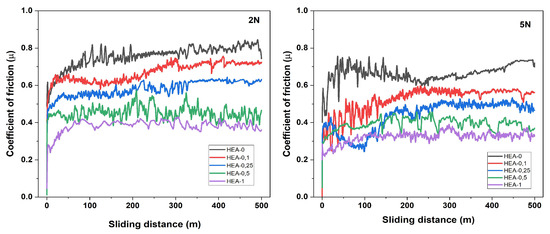 Figure 6. Friction coefficient (μ)–sliding distance curves of AlCoCrFeNiWx HEAs under 2 N and 5 N loads.